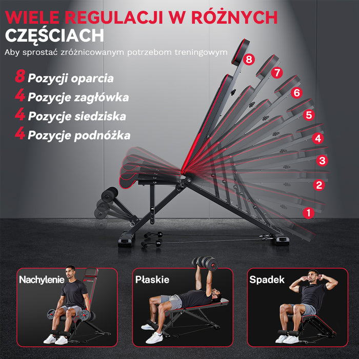 Dzięki 8 pozycjom oparcia, 4 poziomom siedziska, 4 poziomom regulacji zagłówka i 4 poziomom regulacji podnóżka możesz dostosować trening do konkretnych grup mięśni.