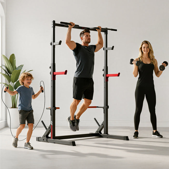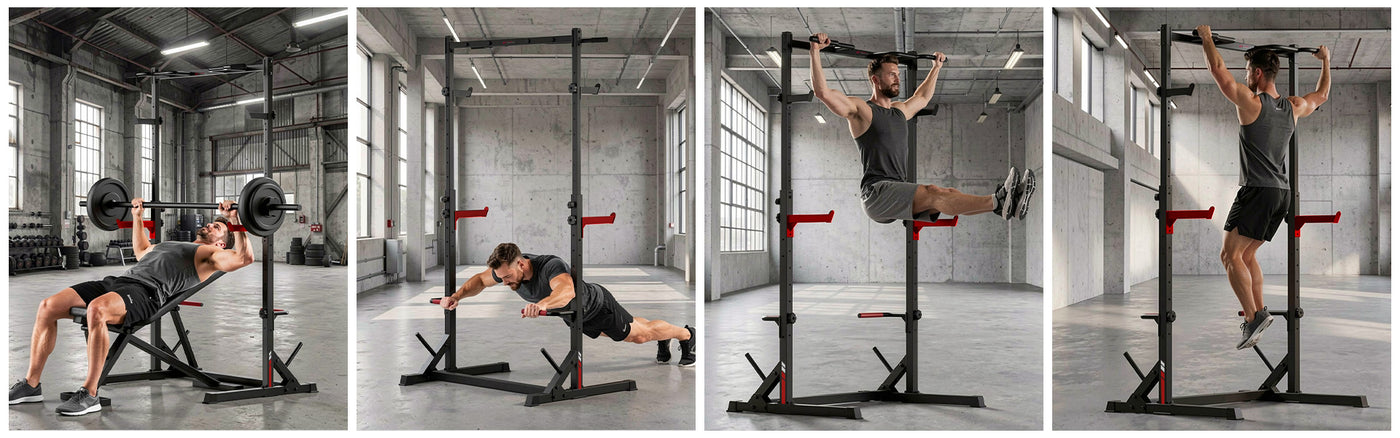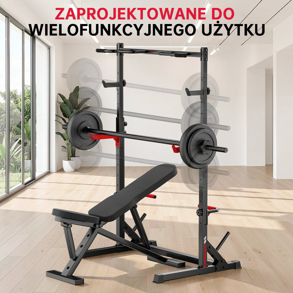 Ten stojak do ćwiczeń jest wyposażony w zestaw akcesoriów treningowych rozszerzających zakres ćwiczeń, m.in. uchwyty do przechowywania talerzy ciężarków, szerokie drążki do podciągania, haki J, ramiona asekuracyjne i drążki do pompek.