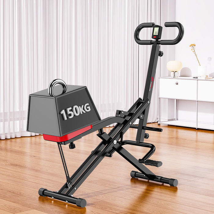 Maksymalny udźwig tej maszyny wspomagającej przysiady wynosi do 150 kg.