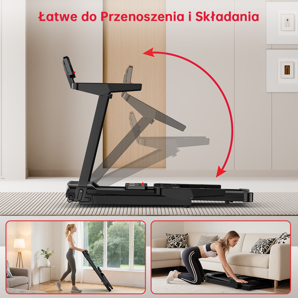 Składana konstrukcja ze zintegrowanymi kółkami transportowymi ułatwia przechowywanie, gdy bieżnia nie jest używana, oraz jej płynne przemieszczanie.